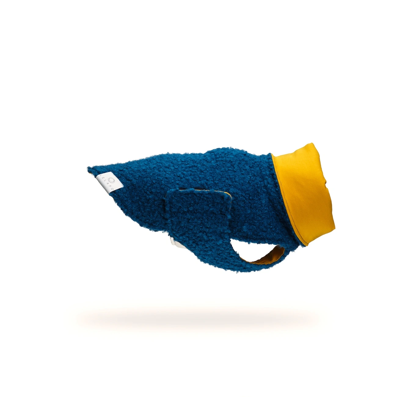 The outer layer in textured bouclé fabric offers structured protection against low temperatures, while the inner lining in cotton jersey helps reduce static and friction — an important detail for maintaining a smooth, knot-free coat. Unlike many synthetic winter garments that electrify the fur or shift during walks, the combination of materials supports thermal comfort without compromising coat health. The extended roll-neck protects throat and ears without limiting head mobility, and the adjustable belt ensures a balanced fit tailored to different body shapes. A discreet back opening allows secure leash or harness attachment without disturbing the garment’s position.