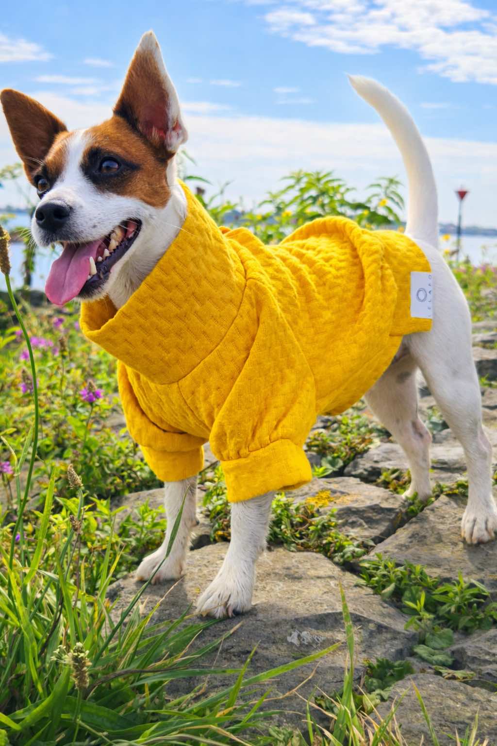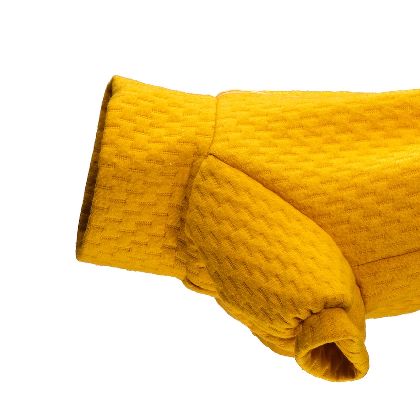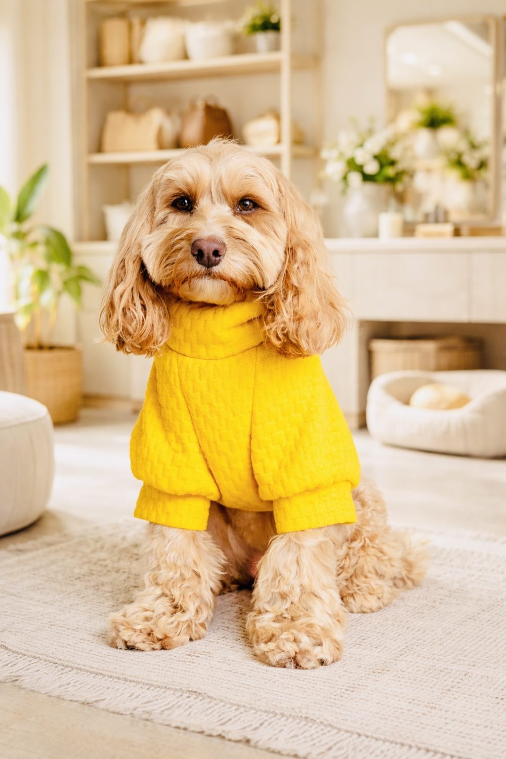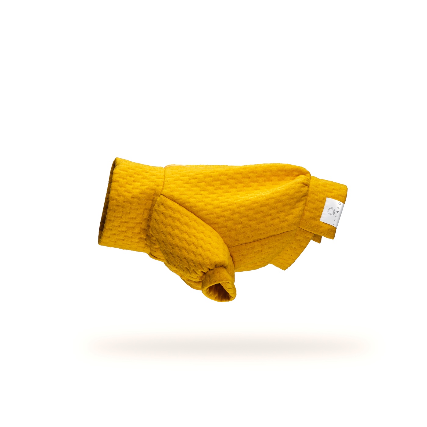 This ochre matelassé dog shirt is designed to offer a soft, flexible layer suitable for milder weather. The fabric has a gently textured matelassé surface that feels smooth and comfortable against the body while maintaining a light structure. Unlike heavier garments, the material remains soft and adaptable, allowing the dog to move naturally.