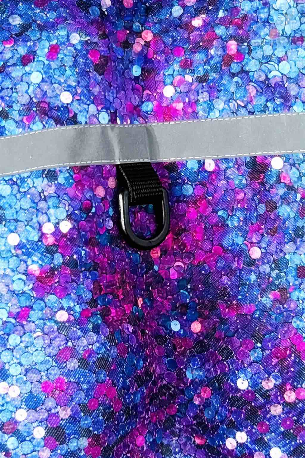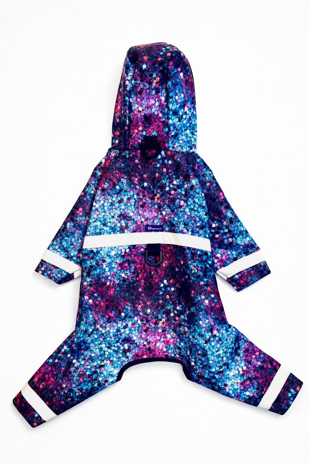 Sono presenti due anelli a D, uno sul collo e uno sul dorso. Permettono l’aggancio del guinzaglio quando necessario. Gli anelli sono realizzati in plastica riciclata. Il capo è un impermeabile e non sostituisce una pettorina.