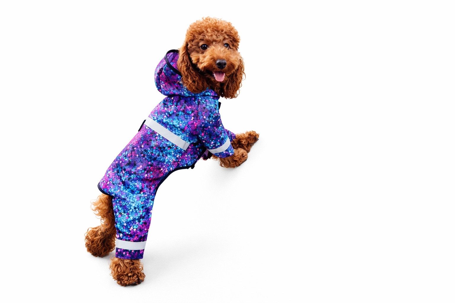 Risultato: protezione dalla pioggia, maggiore visibilità durante le passeggiate serali e una jumpsuit leggera che permette al cane di muoversi naturalmente.